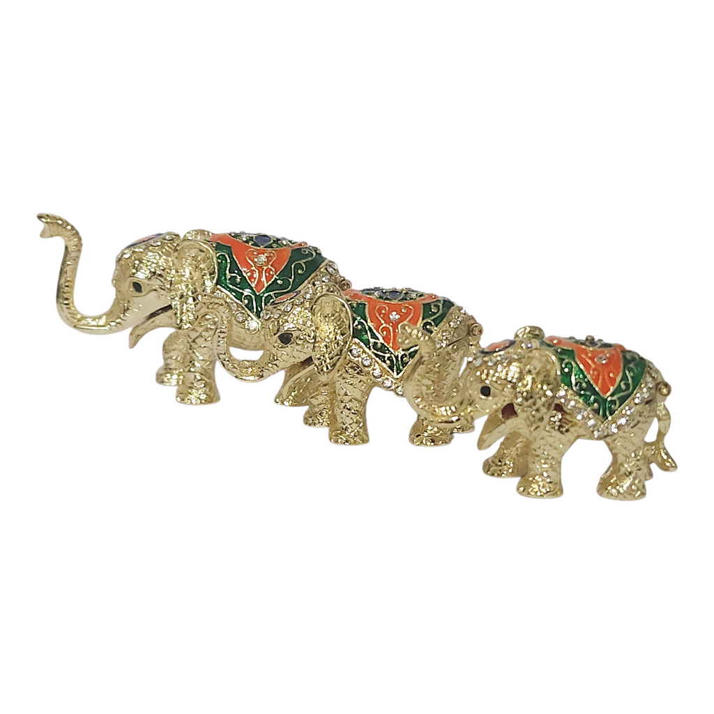 Set 3 Gold & Green Family of Elephants Jewelled Enamel Trinket Box Figurines Set