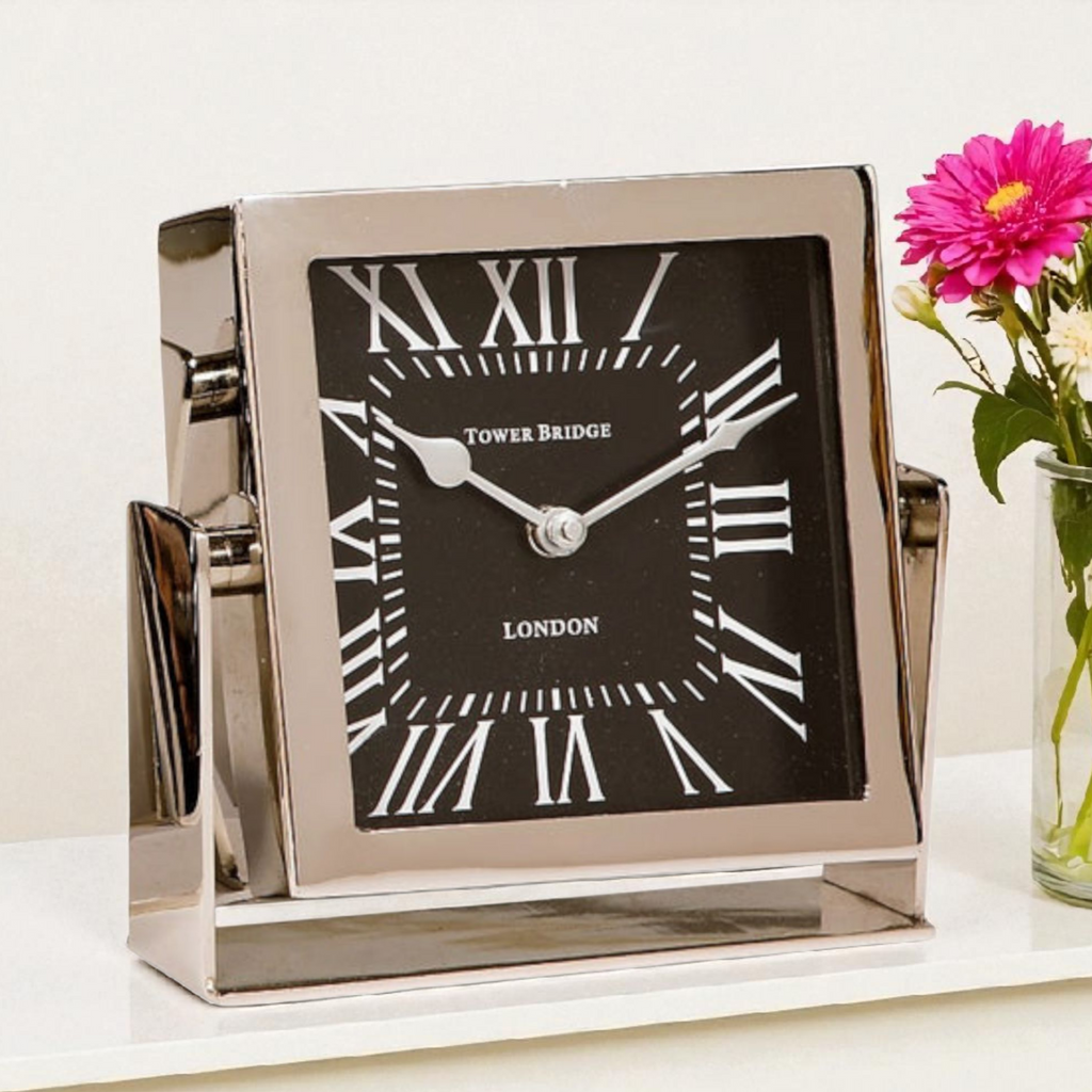 Small Silver Nickel Plated Square Black Face Tower Bridge Mantel Clock