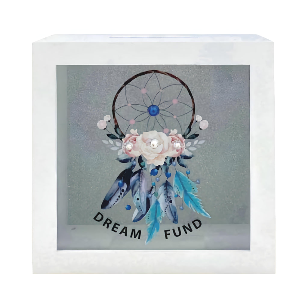 The money box is painted white and has words printed on the front of the clear Perspex panel and it is footed at the bottom.