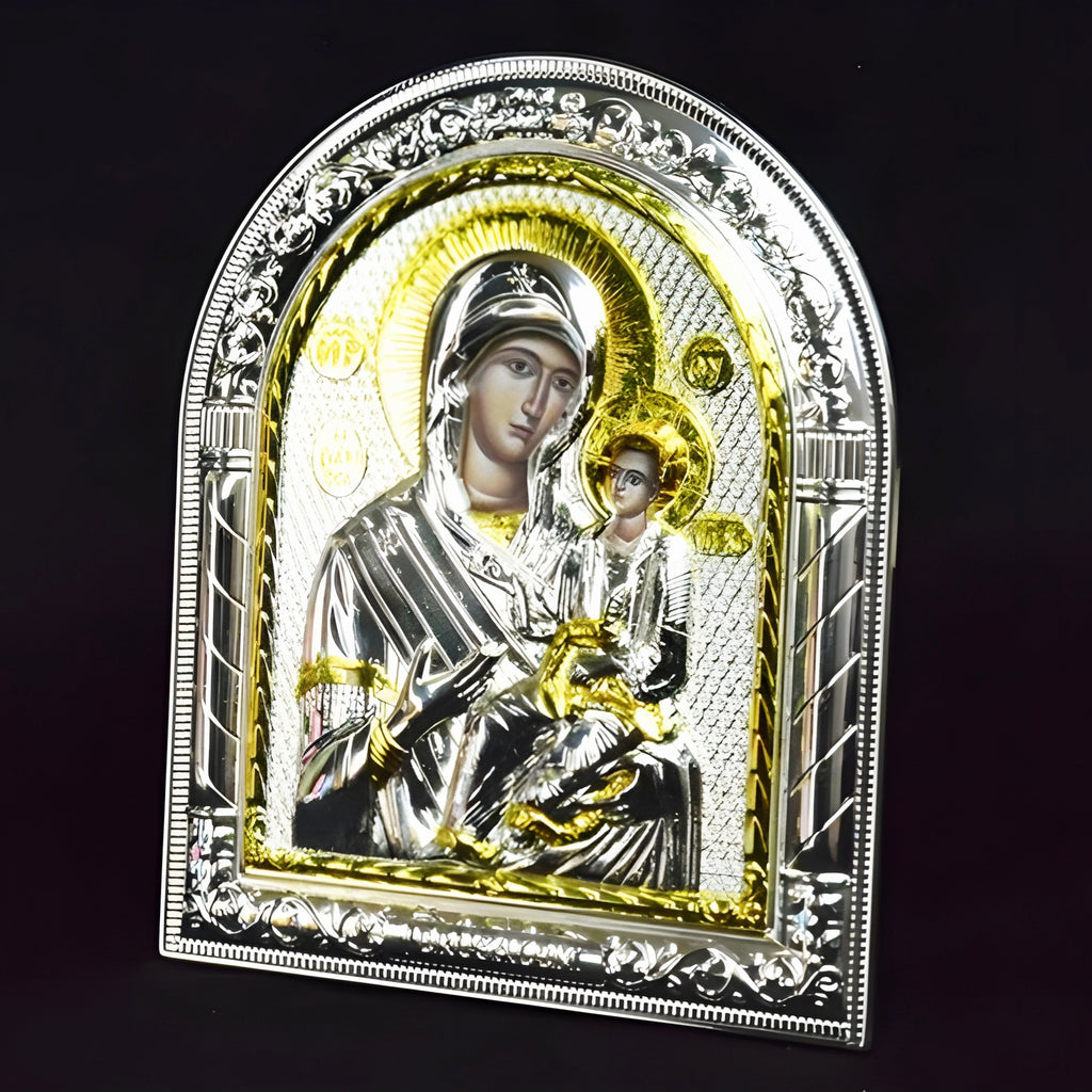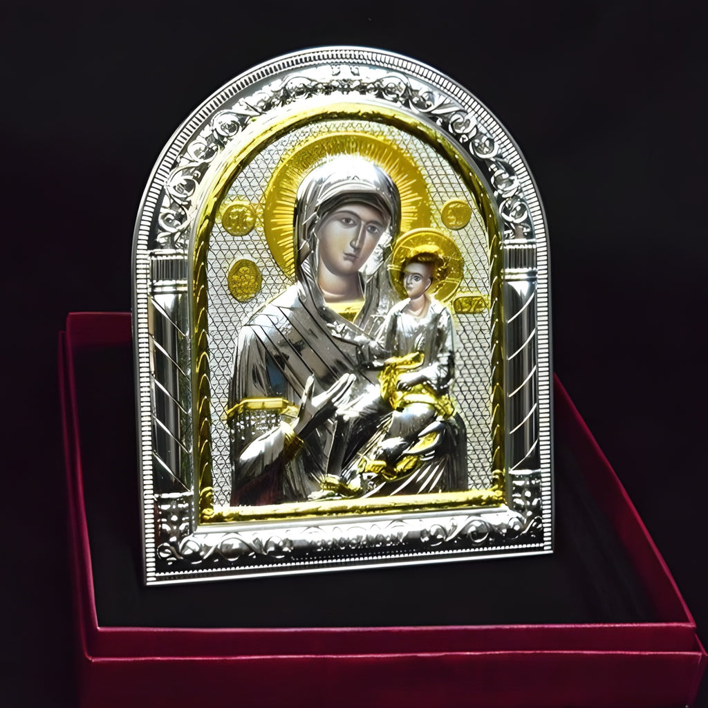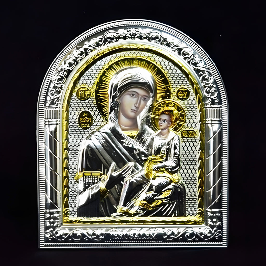 This Orthodox Icon Plaque features a stunning Gold & Silver Plated design of the Holy Mother Mary & Jesus.