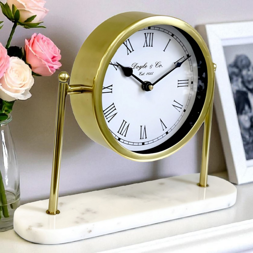 Featuring a sleek design and placed on a white marble base, this clock adds a touch of luxury to any room.