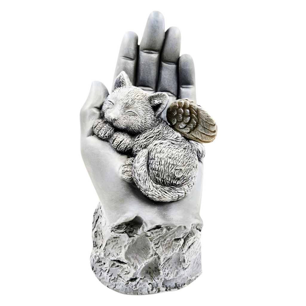 Cat Angel with Wings Sleeping In Hand Solar Light Garden Memorial Statue
