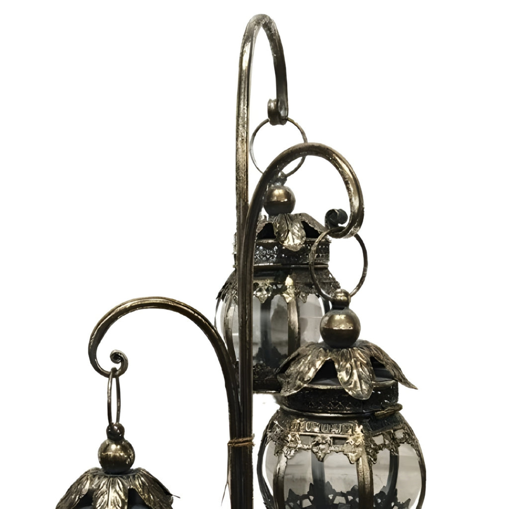 Our Hanging Antique Silver Metal Lanterns come in a set of 3 on a stand.