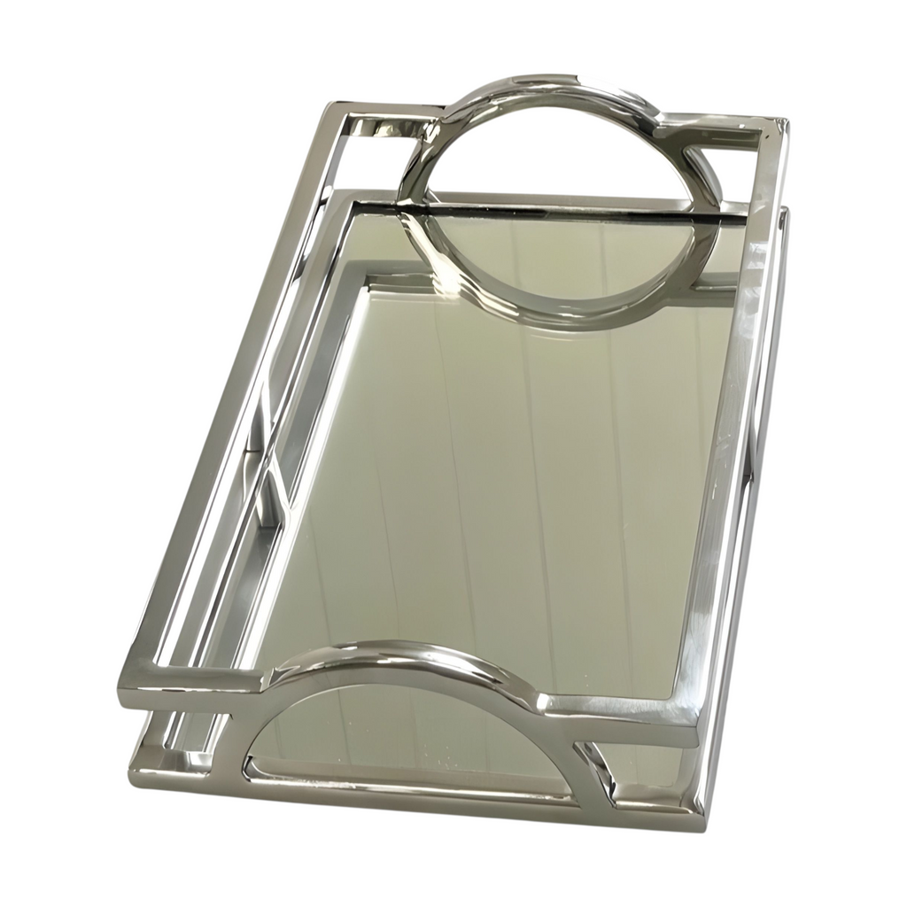 Enhance your home decor with our Silver Rectangle Mirror Tray featuring Arch Handles.