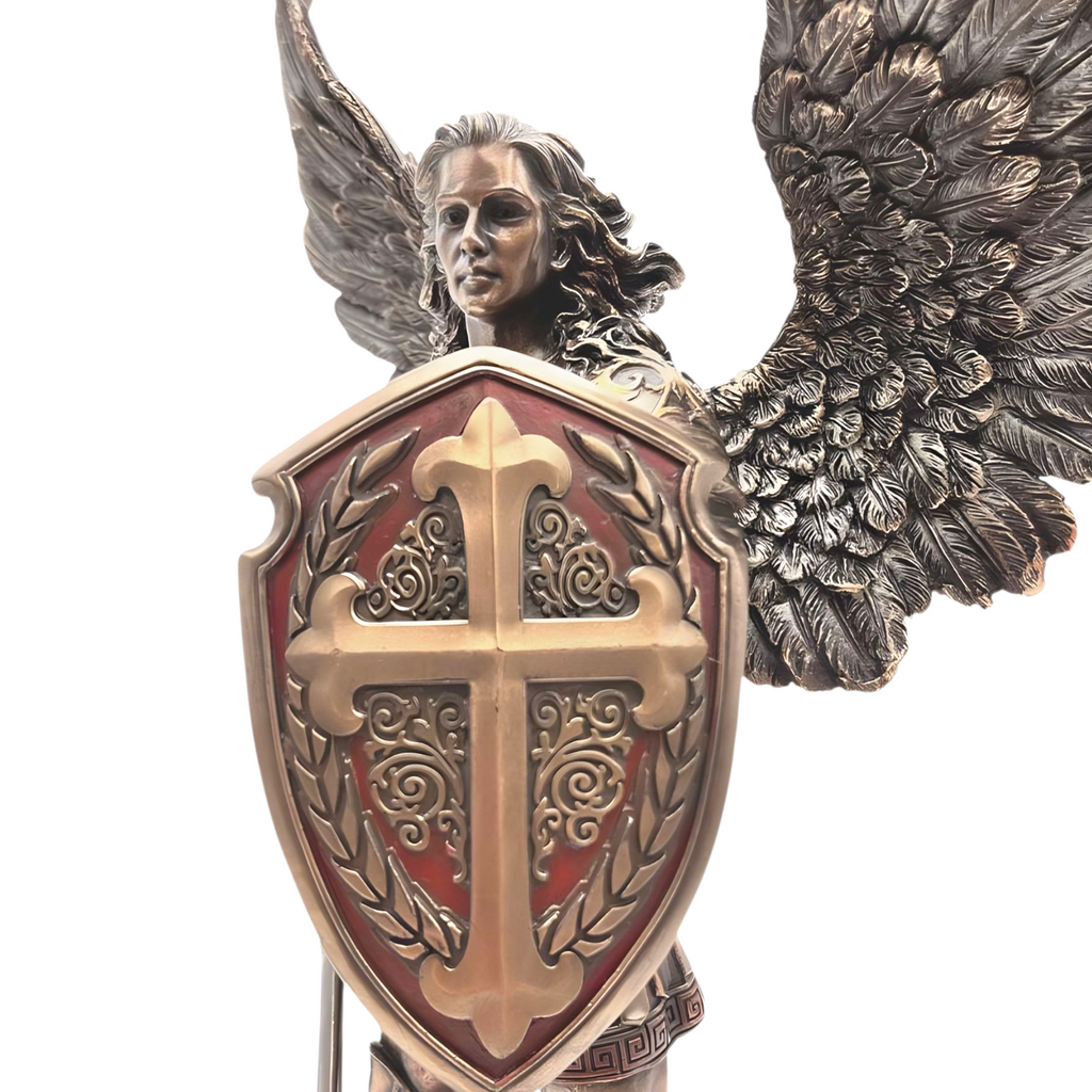 Expertly crafted, this stunning statue depicts Archangel Michael holding his iconic shield, representing strength and protection.