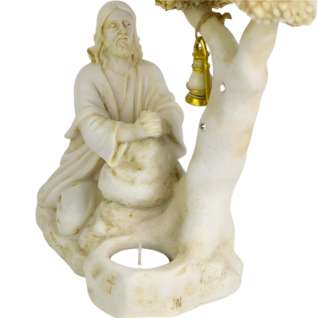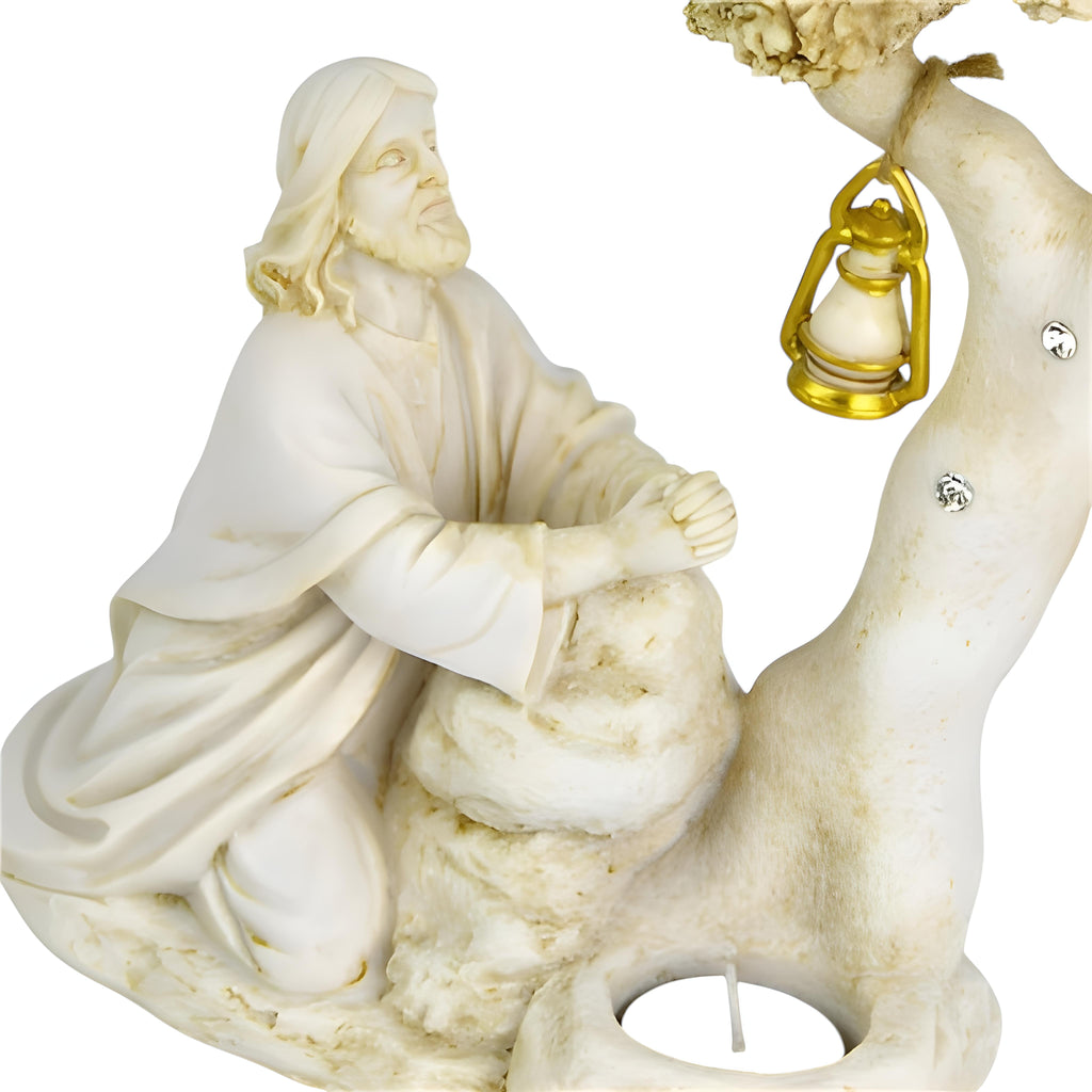 Perfect for displaying a tealight candle, the intricate design depicts Jesus praying under a tree, providing a serene and sacred ambiance.