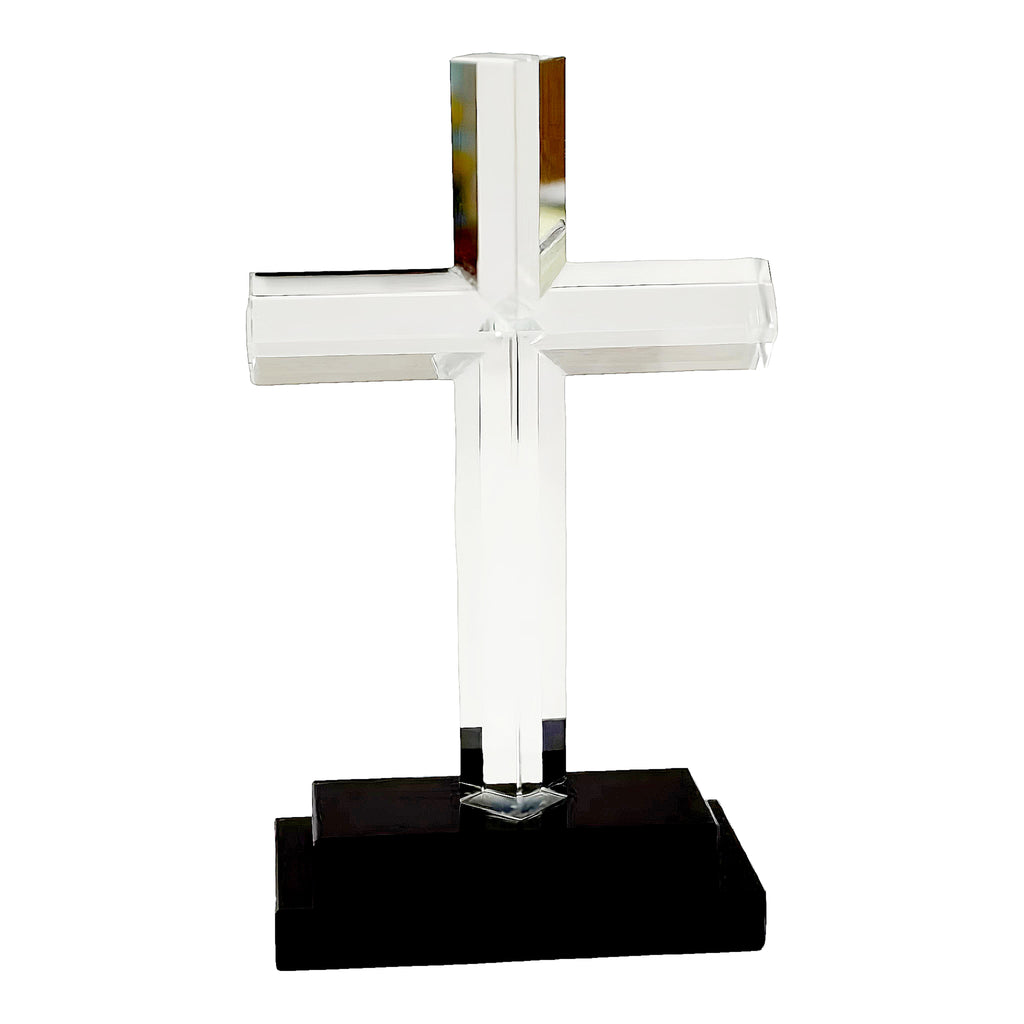 Clear Crystal Cut Glass Standing Religious Cross On Black Stand
