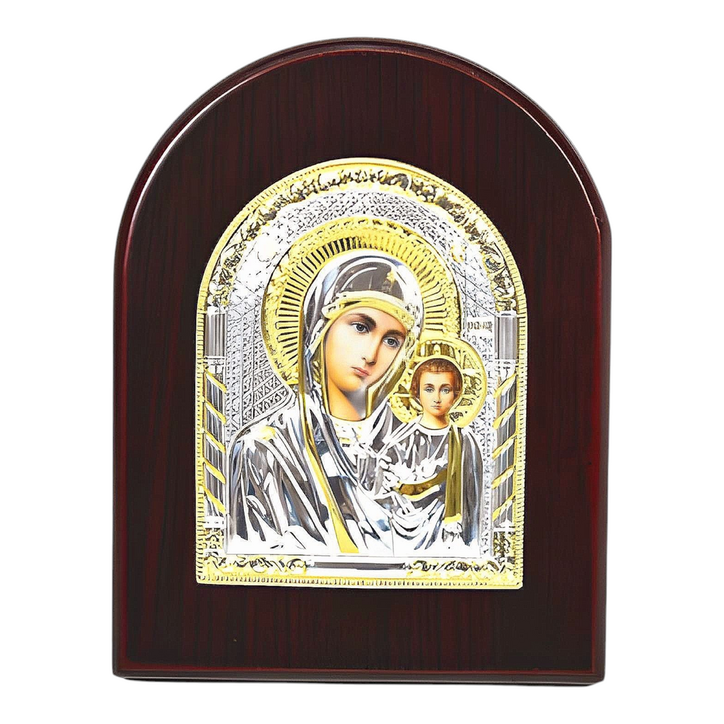 This Orthodox Icon Plaque features a stunning Silver & Gold Plated design of the Holy Mother Mary, displayed on a beautiful Red Wood Frame.