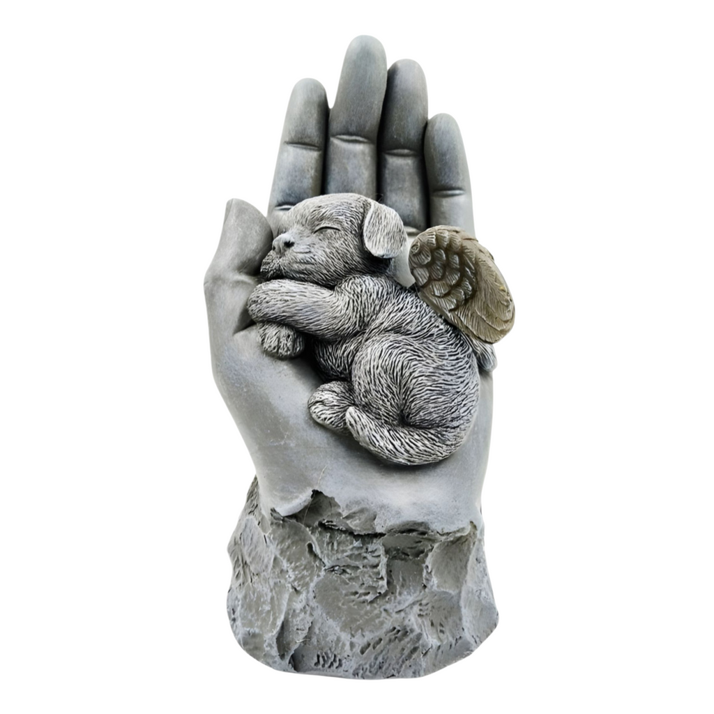 This beautifully crafted statue features a sleeping dog angel cradled in a hand, with a solar light that shines a soft glow at night.